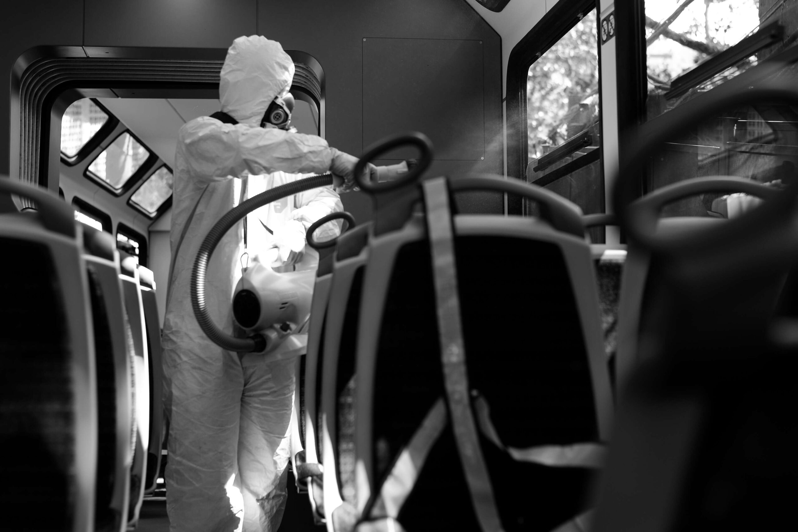 Foto retratando a equipe de desinfecção do Bondinho do Corcovado, organizada e acionada para prevenir a disseminação do vírus quando o monumento do Cristo Redentor foi reaberto à visitação pública, a partir da flexibilização das regras de quarentena. Fotografia editada (pb e tamanho) para publicação no livro "Vidas importam - Memória visual da pandemia COVID-19 no Rio de Janeiro" (Editora iVentura, 2021).
