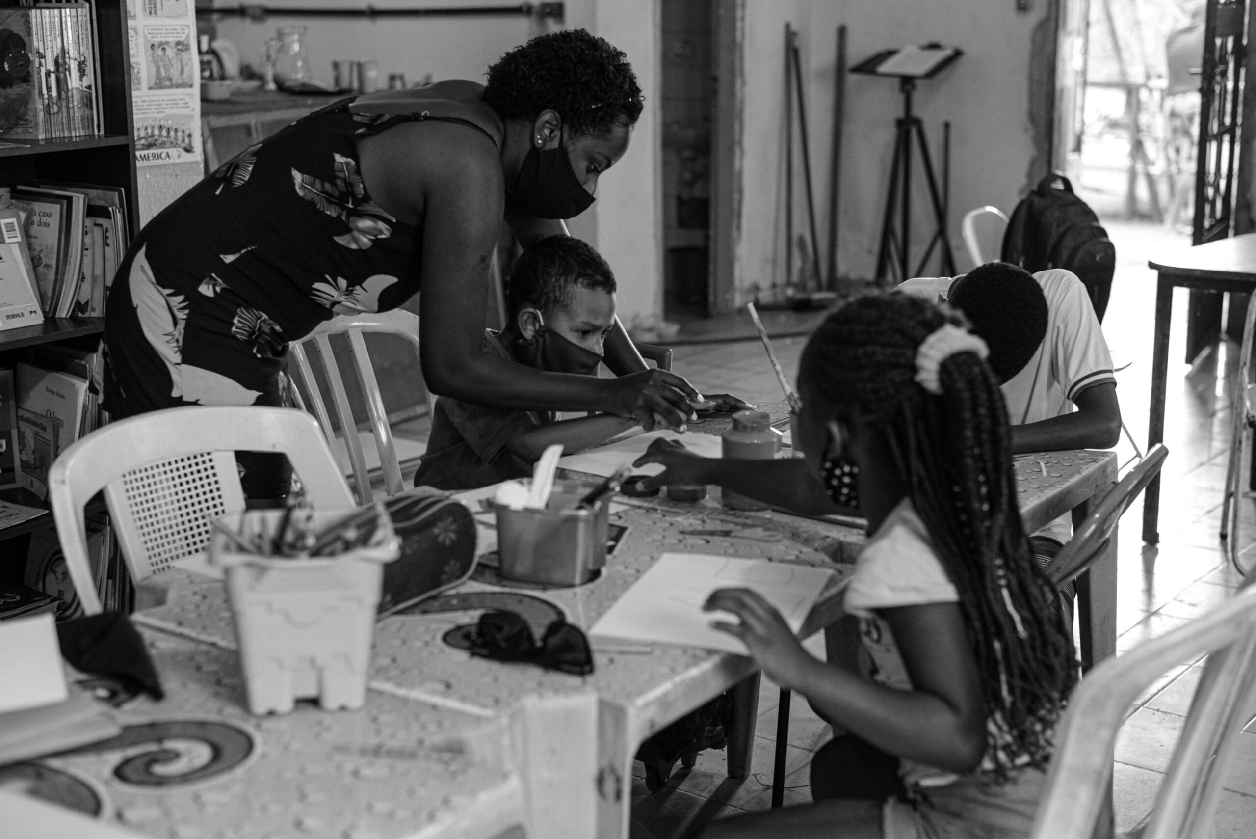 Foto retratando uma turma de crianças e adolescentes do Morro do Salgueiro, na Tijuca, Rio de Janeiro, realizando práticas artísticas. A atividade fez parte dos encontros da educadora Ana Bloch, que desenvolveu estratégias educativas não-formais para ocupar o tempo e desenvolver a aprendizagem de jovens durante o período em que a rede pública de educação municipal permaneceu sem aulas, no período de quarentena. Fotografia editada (pb e tamanho) para publicação no livro "Vidas importam - Memória visual da pandemia COVID-19 no Rio de Janeiro" (Editora iVentura, 2021).