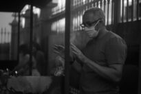 Foto retratando um homem acendendo velas e rezando na Igreja de São Jorge, região central da cidade do Rio de Janeiro, durante as celebrações do santo em meio à pandemia de Covid-19. Fotografia editada (pb e tamanho) para publicação no livro "Vidas importam - Memória visual da pandemia COVID-19 no Rio de Janeiro" (Editora iVentura, 2021).
