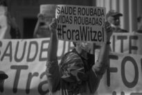 Foto retratando um protesto contra as medidas de isolamento e contra o então governador do estado do Rio de Janeiro, Wilson Witzel, em frente às escadarias da Assembléia Legislativa do Estado do Rio de Janeiro. Na imagem, vemos um homem levantando uma placa com a inscrição "Saúde roubada, Vidas roubadas! #ForaWitzel". Fotografia editada (pb e tamanho) para publicação no livro "Vidas importam - Memória visual da pandemia COVID-19 no Rio de Janeiro" (Editora iVentura, 2021).