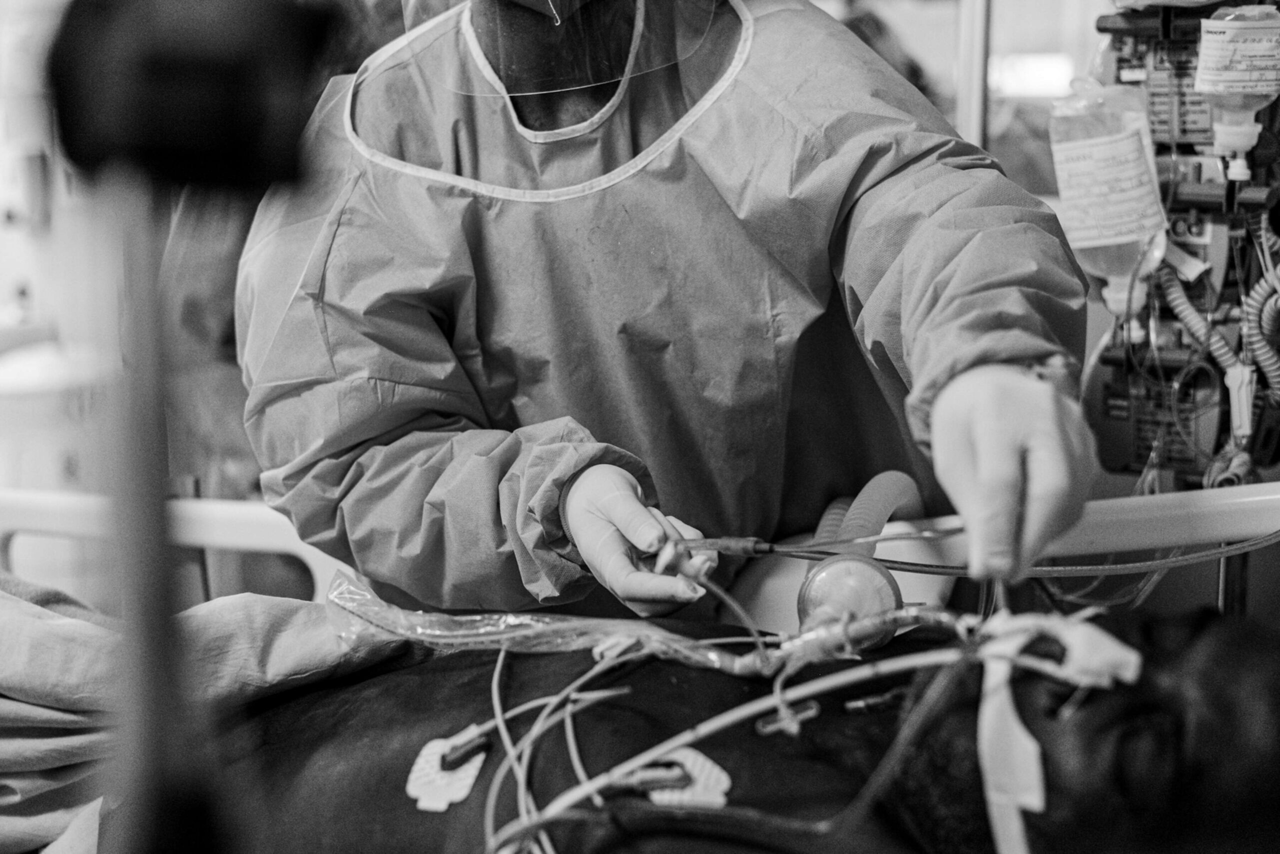 Foto retratando a rotina da Unidade de Tratamento Intensivo (UTI) do Hospital Universitário Clementino Fraga, da UFRJ, na Ilha do Fundão, Rio de Janeiro. Na imagem, vemos profissional de saúde ajustando os aparelhos utilizados / medicamentos recebidos por paciente deitado em maca. Fotografia editada (pb e tamanho) para publicação no livro "Vidas importam - Memória visual da pandemia COVID-19 no Rio de Janeiro" (Editora iVentura, 2021).